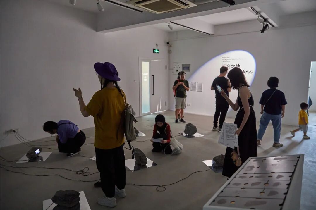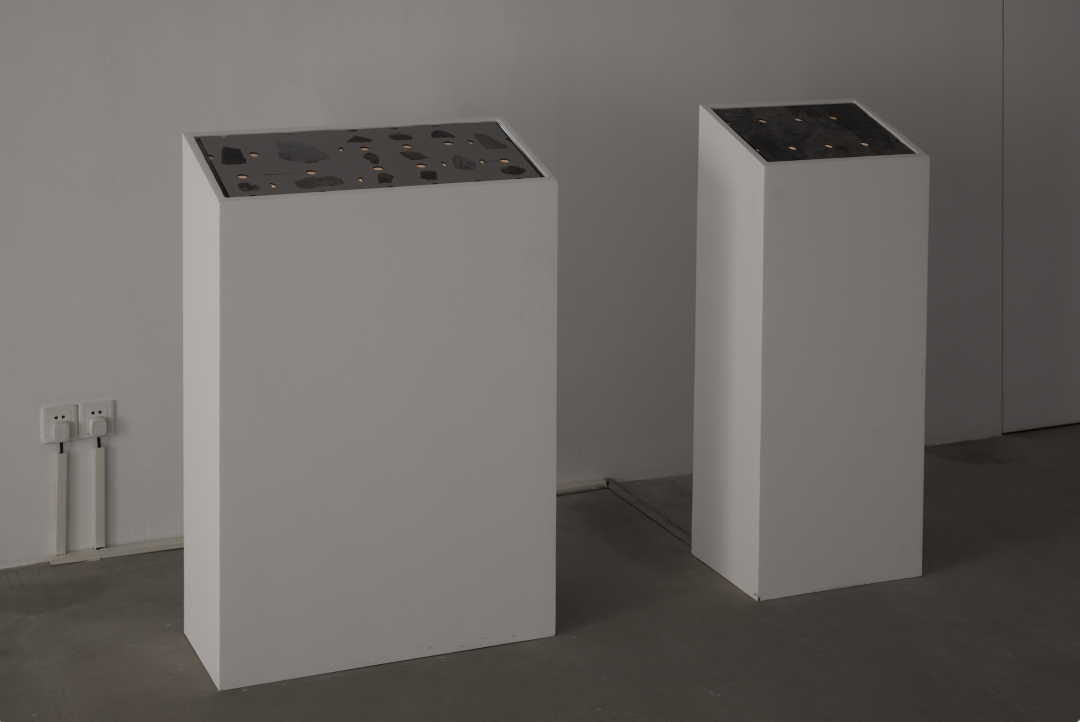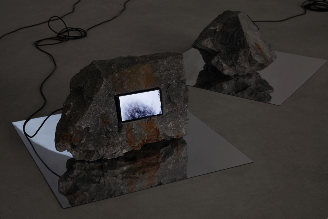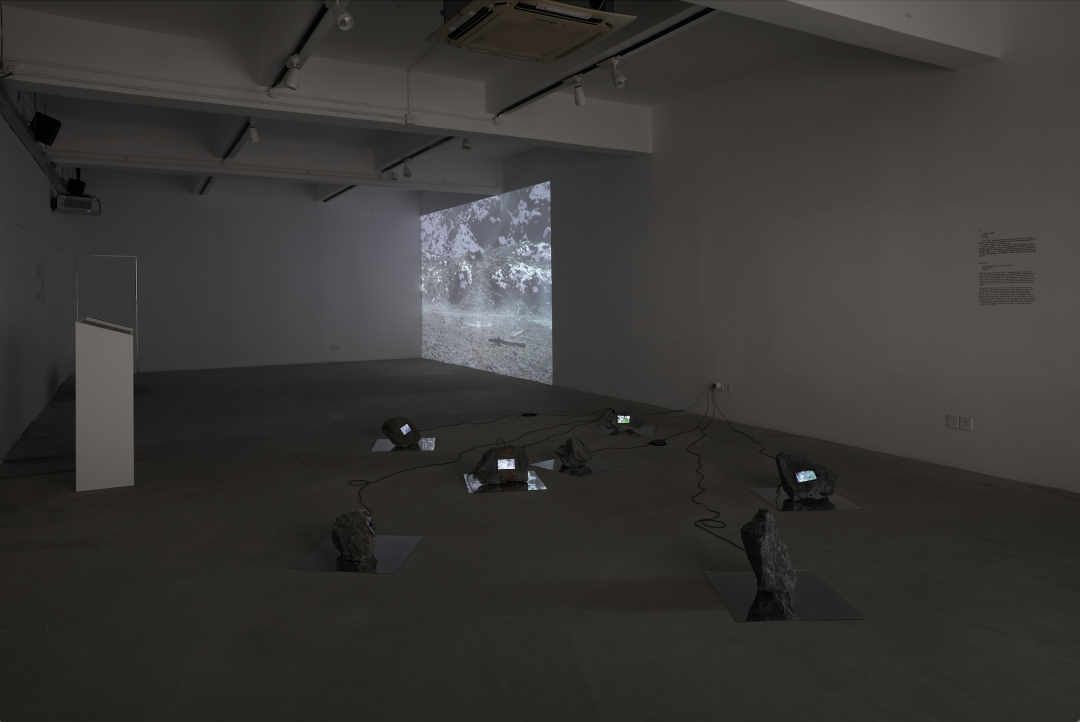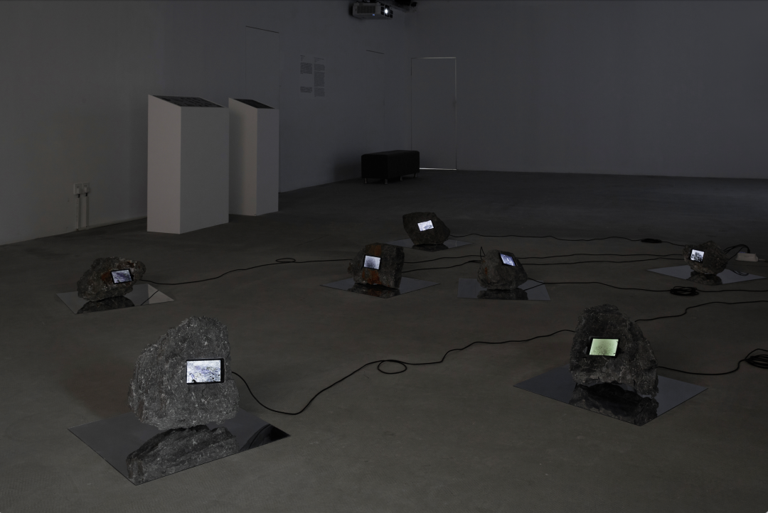 Heartbeats in another corner of the space consists of a few stones scattered on the floor. They are the tailings, the waste part of an ore left over after the mineral extraction, collected by Chen from derelict mining sites on the Hengduan. A screen is placed on each stone, displaying images captured by the infrared cameras Chen positioned on the boundary between the mining sites and wilderness areas. The appearance of wandering animals, flying bugs, or some unknown movements on the screen reminds the viewers of a reality in the uneconomic land of “anthropogenic ruins” that lies beyond the human horizon.