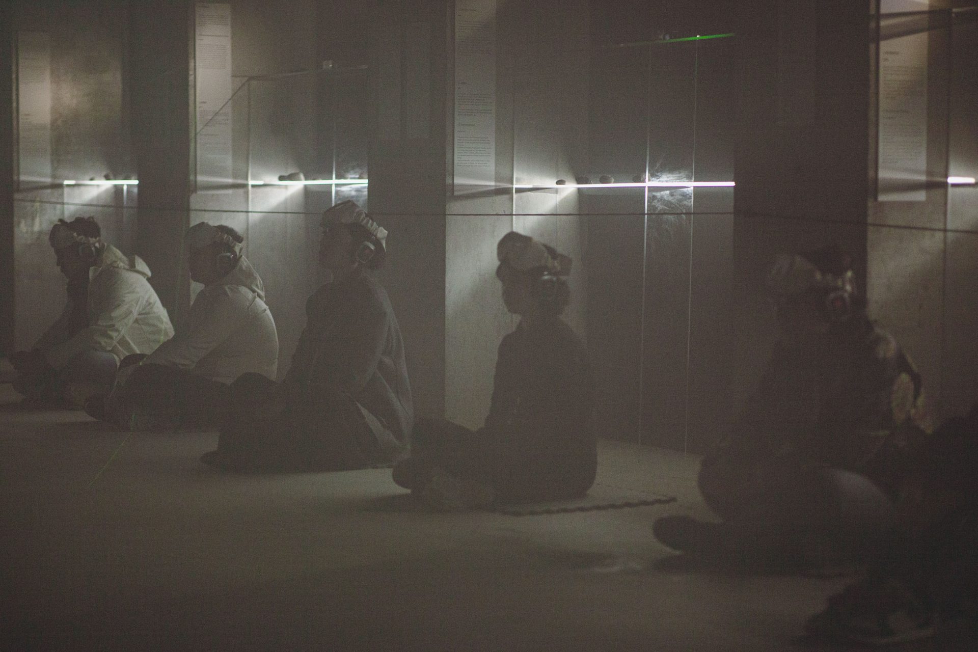 Groups of twenty participants surrender their autonomy to the collective expression of rivers. To embody the river is not something one observes – it is something one undergoes. In each session, they are divided into two roles: stones and water. The stones remain still while the water moves among them, simulating the current’s approach, pressure, and convergence. Participants receive wireless headphones and goggles that obscure sight and turn the gaze inward. Smell and touch are the work’s first language – a language that bypasses vision and logic, touches memory, and opens the body to another kind of knowing. Within this sensory environment,participants are guided by voices set into motion through hand-to-hand intra-action.