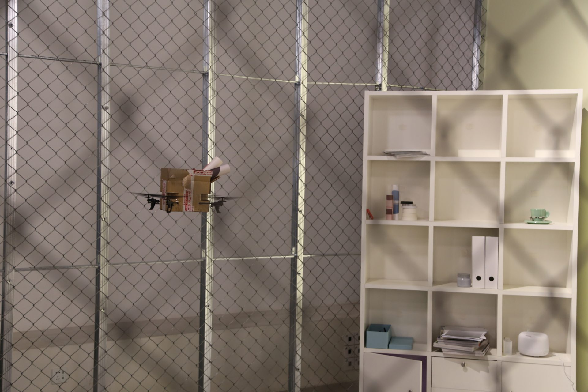 Viewers entering the exhibition space will first encounter an array of hovering hyper-physical objects within Samuel Adam Swope’s staged house: Floating Room. Conceived as a sensorial, sculptural installation, Floating Room shapes interfaces between our things, flight, and air, and between fantasy and digital realization, transforming the domestic space from static and quiet dust-collecting rooms into sensational buzzing, windy soundscapes. From taking off, to hovering or drifting, and then landing, these floating technological-domestic hybrids touch other home interior artifacts through air currents or impact, embodying a message that mixes humor and narration into contemporary inquiries regarding emerging flight technologies, novel approaches to product delivery, and future smart homes.
